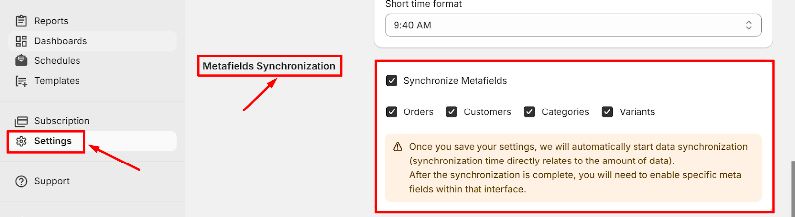 - Updated Reports: Once synchronization is enabled, Metafield data will be synced, and the previously empty columns in your reports should display the expected data.