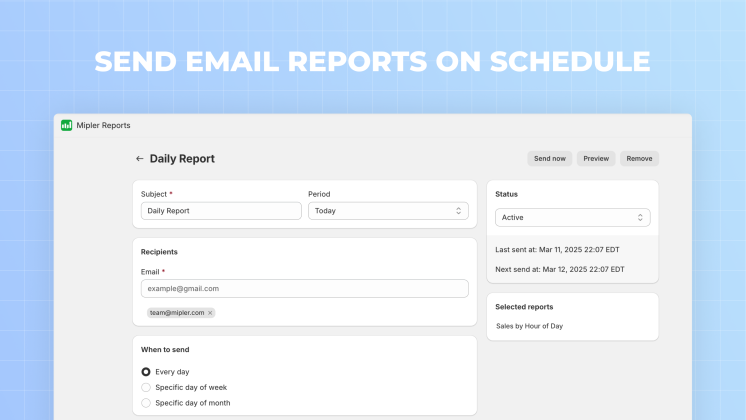 For ongoing insights, you can automate the report. Mipler allows you to schedule the Shopify Fulfillment Report to be emailed to you (and your team) automatically. Set it to send you a report every morning with yesterday’s hourly sales breakdown. You can also schedule weekly or monthly summaries. Automation ensures your hourly sales data is always at your fingertips without manual effort.